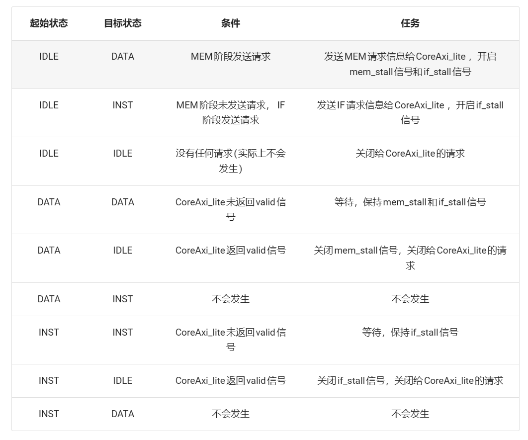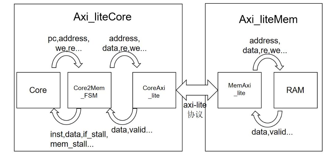 此时,AXI_liteCore会给Core传递两个信号:IF_Stall和MEM_stall,分别处理在IF,MEM两阶段向RAM发送请求时Core中指令的等待。