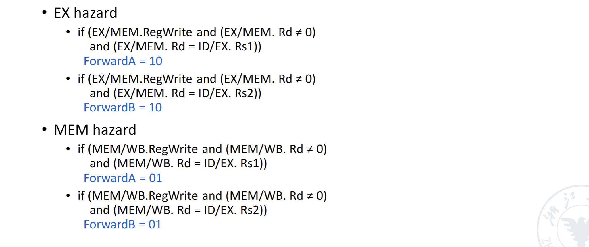 - Forwarding只发生在MEM/WB指令对rd寄存器写寄存器时触发