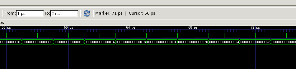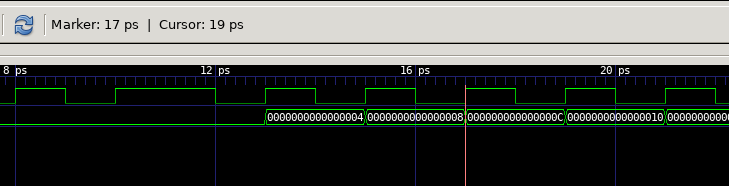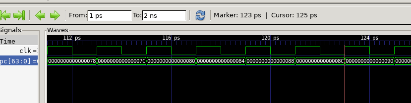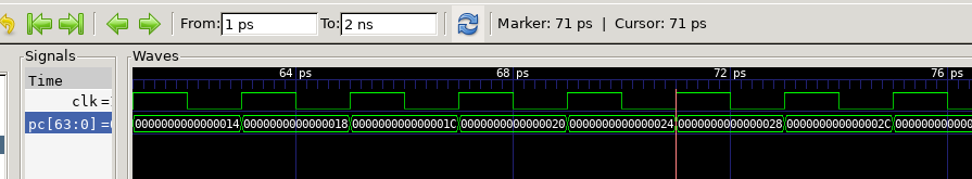 使用SCPU 运行syn.hex, make wave观察仿真波形,调取test1处的的波段,计算运行的周期数(T)和指令条数(N),算出CPI。