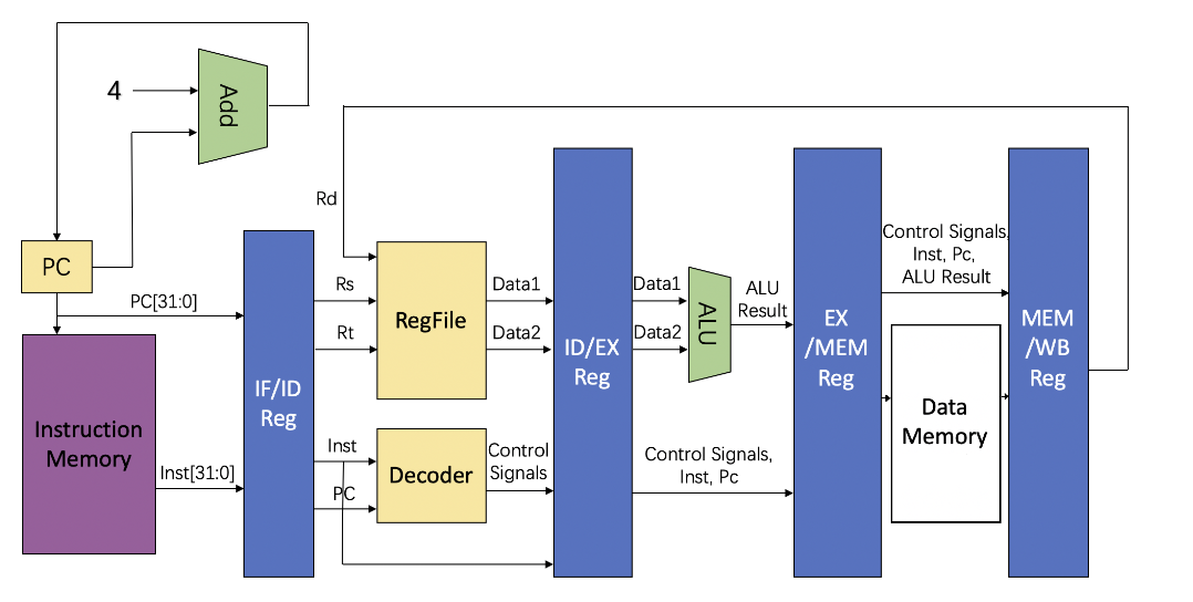同时我们注意到除了各个阶段的划分,Pipeline中还添加了四个阶段间寄存器分别为: