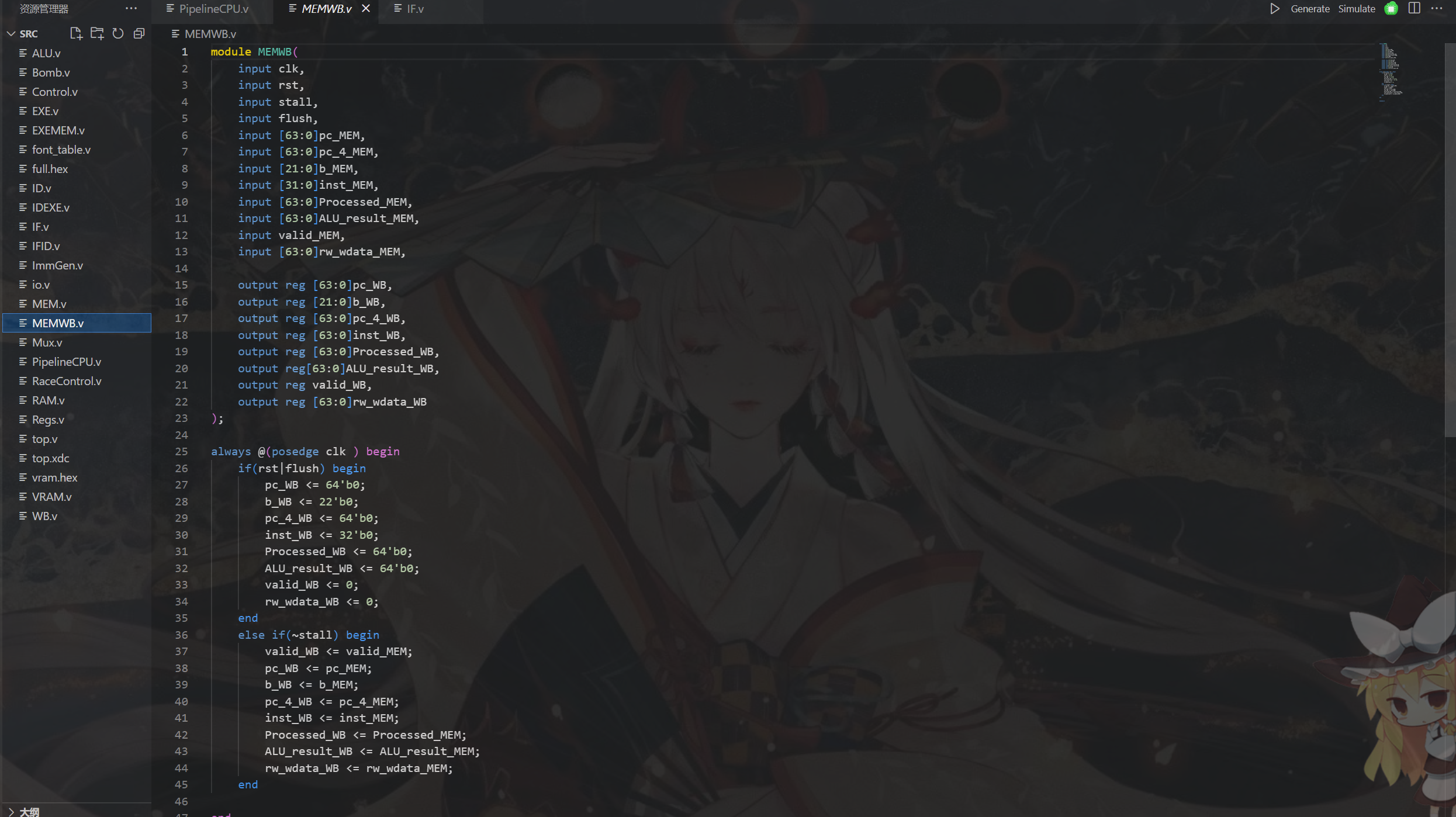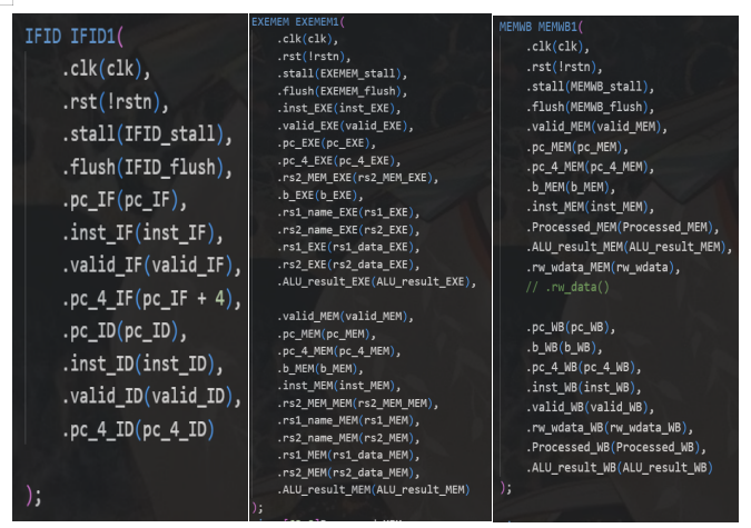 类似于上面展示出的IFID阶段间寄存器,我们可以写出IDEXE, EXEMEM, MEMWB。代码在此不表~