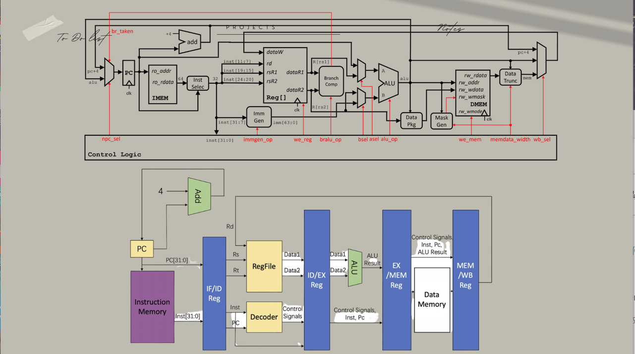 由上述原理图可以看到,我们在SCPU中使用的许多模块在PipeLine中仍然需要用到,且这些模块的内部结构并未发生很大变化。