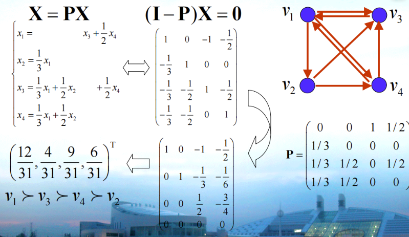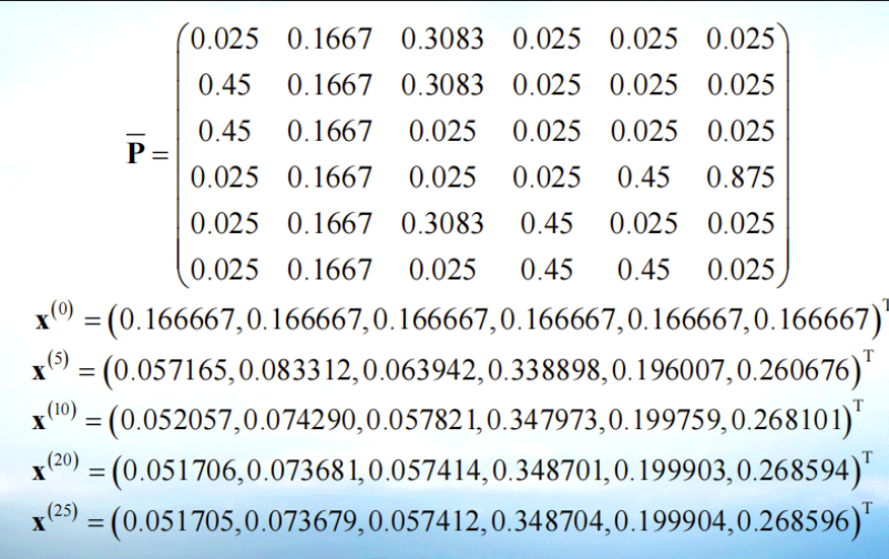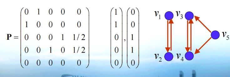 - 链接矩阵为一随机矩阵,该矩阵属于特征值1的特征向量即为重要度向量