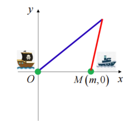 建立数学模型,以海盗船初始位置为原点,商船初始位置为
