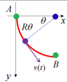 ,半径为 的圆弧轨道从 运动到 ,求该质点的运动时间 设质点开始运动时刻为 , 时刻质点所在位置x轴夹角为 ,速率为 可以得到, 时刻,质点的纵坐标为 ,质点运动过的距离为