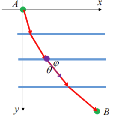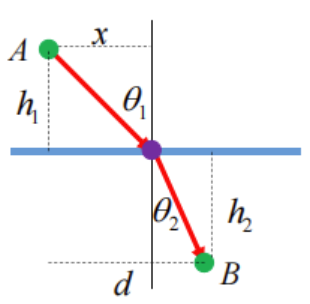 水平距离为 的点,光传播所需时间为: 对x求导得:(因为匀速运动,所以导数为0) 根据各种数值关系化简得: - 设光在点