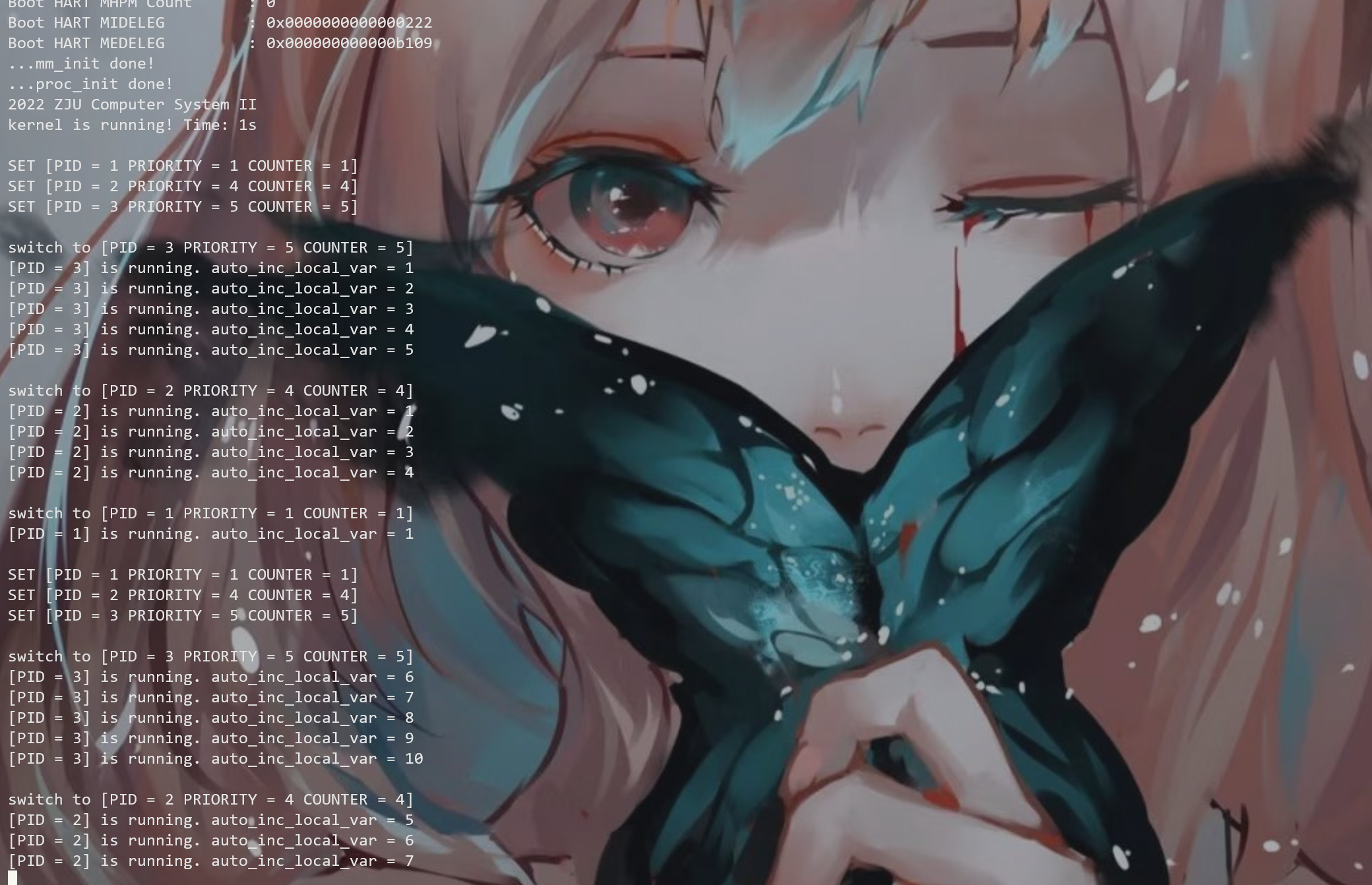 1 2 3 4 5 6 7 8 9 10 11 12 13 14 15 16 17 18 19 20 21 22 23 24 25 26 27 28 29 30 31 32 33 34 35 void task_init () { idle = (struct task_struct*) kalloc(); idle->state = TASK_RUNNING; idle->counter = 0 ; idle->priority = 0 ; idle->pid = 0 ; current = idle; task[0 ] = idle; int i = 0 ; for (i = 1 ;i < NR_TASKS; i++){ struct task_struct * temp = (struct task_struct *)kalloc(); temp->state = TASK_RUNNING; temp->counter = 0 ; temp->priority = (uint64)rand()%(PRIORITY_MAX-PRIORITY_MIN+1 )+PRIORITY_MIN; temp->pid = i; (temp->thread).ra = (uint64)__dummy; (temp->thread).sp = (uint64)temp+PGSIZE; task[i] = temp; } printk("...proc_init done!\n" ); }