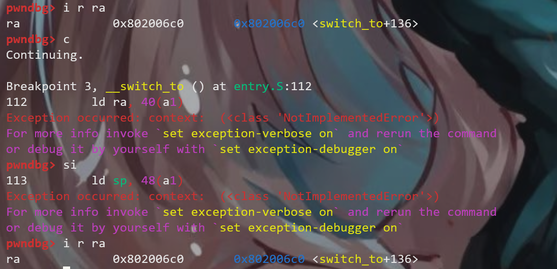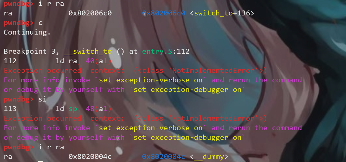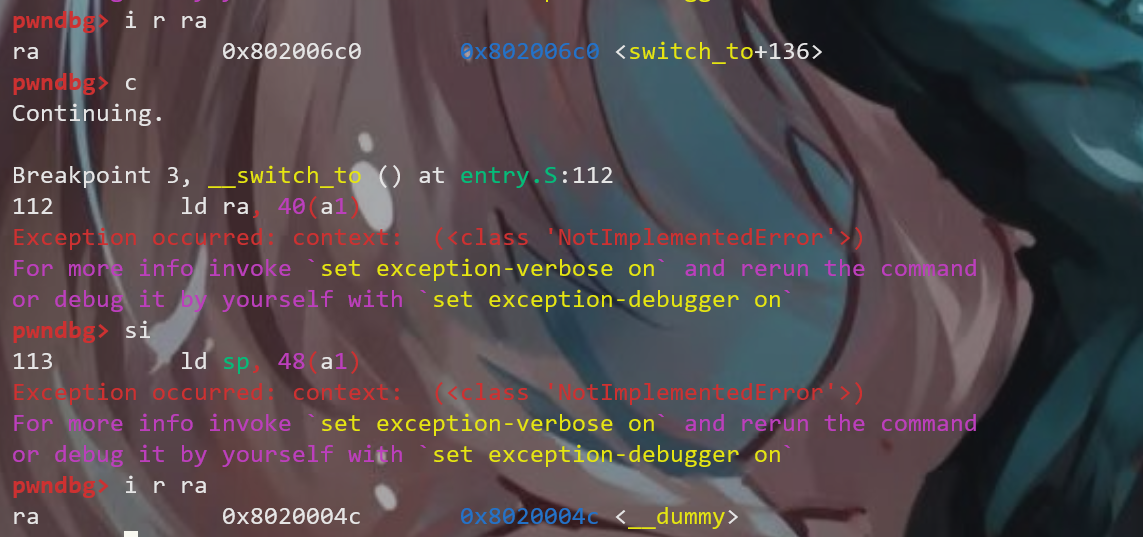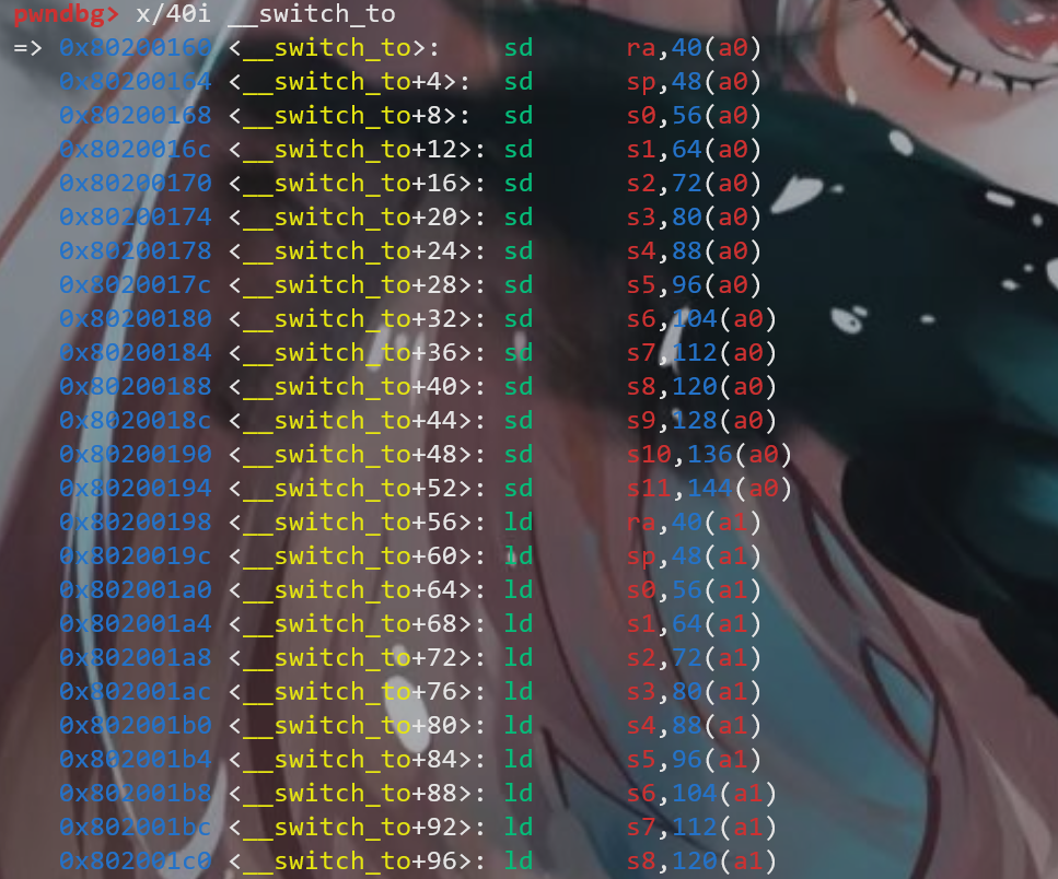 查看__swtich_to段的地址,并在上下两天sd ra,ld ra处打断点
