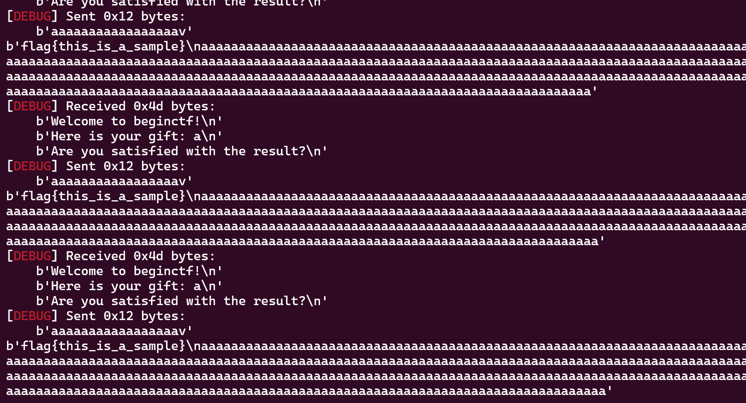 1 2 3 4 5 6 7 8 9 10 11 12 13 14 15 16 int __cdecl main (int argc, const char **argv, const char **envp) { char v4[8 ]; char buf; setvbuf(stdin , 0LL , 2 , 0LL ); setvbuf(stdout , 0LL , 2 , 0LL ); setvbuf(stderr , 0LL , 2 , 0LL ); puts ("Welcome to beginctf!" ); open("flag" , 0 ); read(3 , &buf, 1uLL ); printf ("Here is your gift: %c\n" , (unsigned int )buf); puts ("Are you satisfied with the result?" ); read(0 , v4, 0x12 uLL); return 0 ; }