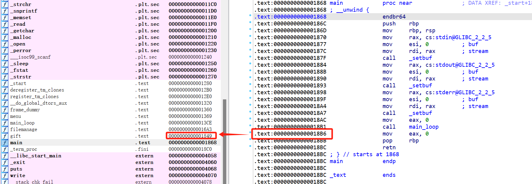且main_loop的返回地址与gift函数的地址只有最低字节不同,可以考虑利用数组越界,修改main_loop函数返回地址的末尾字节为0x49,使得main_loop结束后跳转到gift执行后门函数。