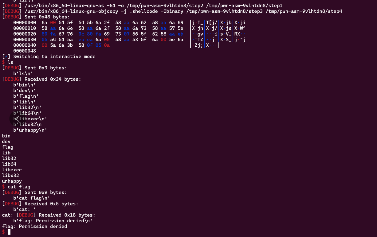 1 2 3 4 5 6 7 8 9 10 11 12 13 14 15 16 17 18 19 20 21 22 23 24 25 26 27 28 29 30 31 32 33 34 35 36 37 38 39 40 41 42 43 44 45 int __cdecl main (int argc, const char **argv, const char **envp) { int result; void *addr; addr = mmap((void *)0xFFF00000 LL, 0x1000 uLL, 7 , 34 , -1 , 0LL ); if ( addr == (void *)-1LL ) { perror("mmap failed" ); result = 1 ; } else { read(0 , addr, 0x100 uLL); check((__int64)addr); ((void (*)(void ))addr)(); if ( munmap(addr, 0x1000 uLL) == -1 ) { perror("munmap failed" ); result = 1 ; } else { result = 0 ; } } return result; } __int64 __fastcall check (__int64 a1) { __int64 result; char v2; int i; for ( i = 0 ; i <= 255 ; ++i ) { result = *(unsigned __int8 *)(i + a1); v2 = *(_BYTE *)(i + a1); if ( v2 == 'h' || v2 == 97 || v2 == 112 || v2 == 121 || v2 == 72 || v2 == 65 || v2 == 80 || v2 == 89 ) exit (-1 ); } return result; }
