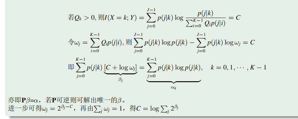 达到转移概率 的离散无记忆信道容量C的充要条件为: