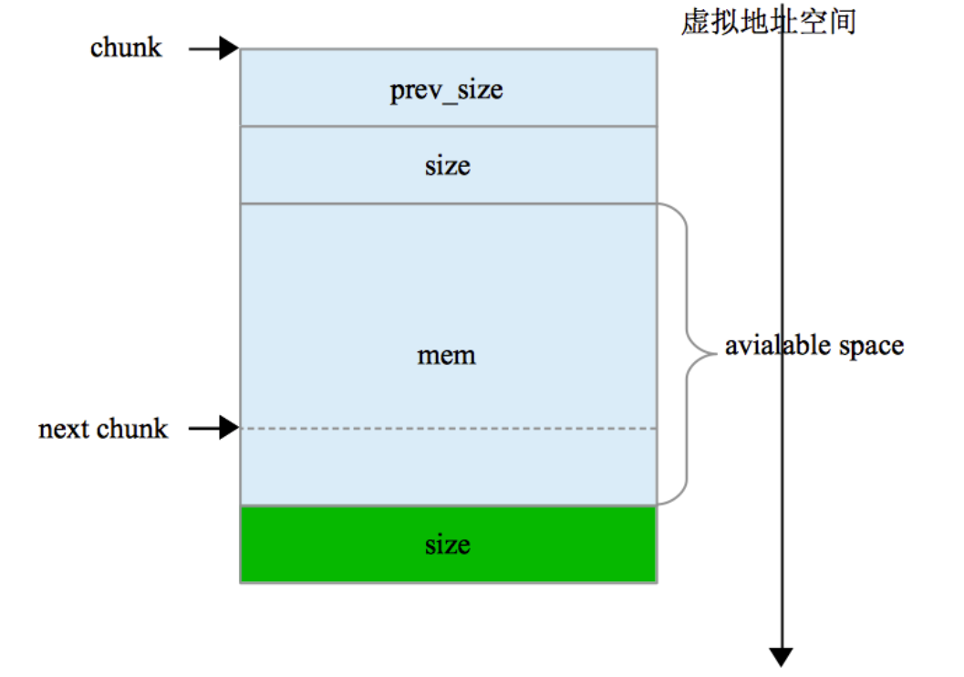 从上面的分析可以看出malloc_chunk设计是巧妙的,prev_size字段可以通过它来找到地址相邻空闲的上一个chunk,使得合并空闲的chunk十分方便,同时如果当前chunk的前一个chunk是使用中的,prev_size的空间可以借给上一个chunk作为可用空间。