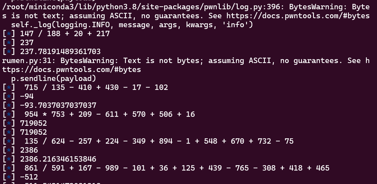 1 2 3 4 5 6 7 8 9 10 11 12 13 14 15 16 17 18 19 20 21 22 23 24 25 26 27 28 29 30 31 32 from pwn import *from wstube import websocketimport mathp = websocket("wss://ctf.xidian.edu.cn/api/traffic/yPC0muu0Vi9OKlVsJTQPl?port=9999" ) p.recvline() p.recvline() for i in range (2 ): to_do = p.recvuntil(b"=" )[:-1 ] payload = str (round (eval (to_do.decode()))) p.sendline(payload) p.recvline() while (1 ): to_do = p.recvuntil(b"=" )[:-1 ].replace(b"\n" , b"" ) log.info(to_do) payload_float = eval (to_do.decode()) payload = str (math.floor(eval (to_do.decode()))) log.info(payload) log.info(payload_float) p.sendline(payload) p.interactive()