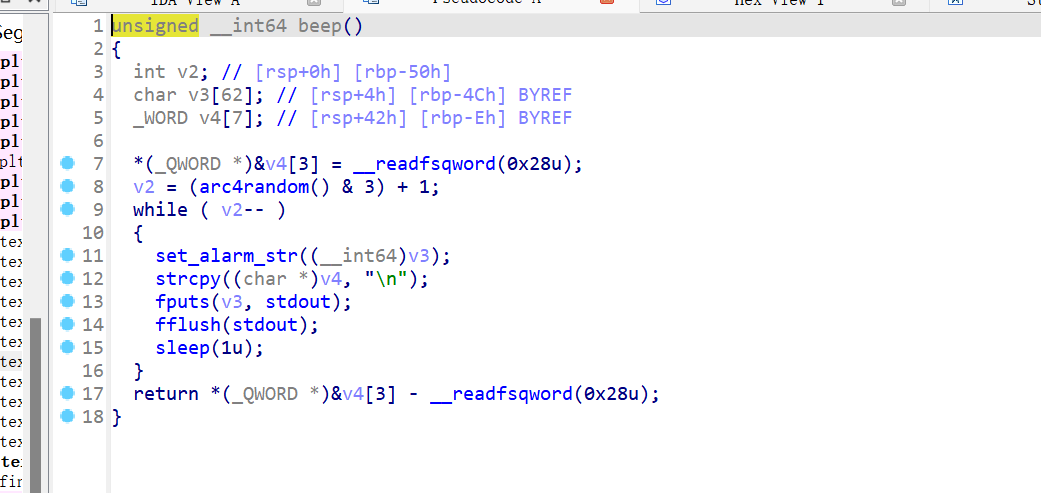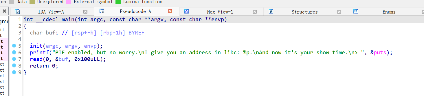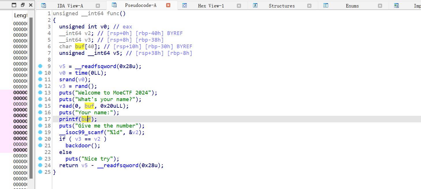 IDA查看有一个后门函数,开了PIE,有一个格式化字符串漏洞。