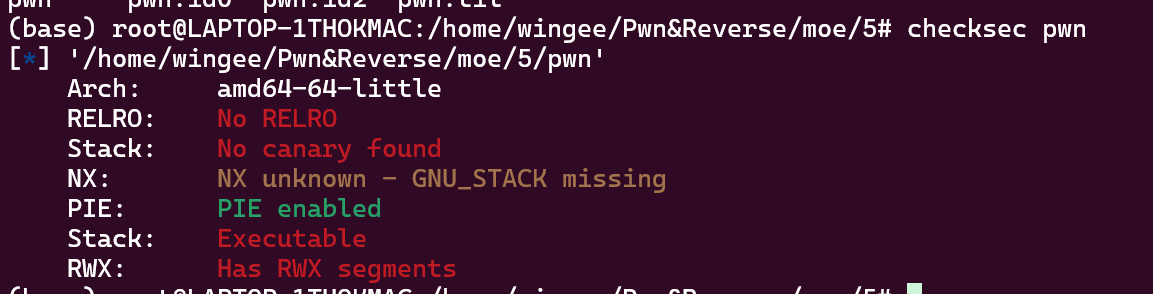 1 2 3 4 5 6 7 8 # 00 :0000 │ rsp 0x7fffffffdc20 —▸ 0x40129e (main) ◂— endbr64 # 01 :0008 │-008 0x7fffffffdc28 ◂— 0x3004011fa # 02 :0010 │ rbp 0x7fffffffdc30 —▸ 0x7fffffffdc40 ◂— 1 # 03 :0018 │+008 0x7fffffffdc38 —▸ 0x4012ba (main+28 ) ◂— mov eax , 0 # 09 :0048 │+038 0x7fffffffdc68 —▸ 0x7fffffffdd58 —▸ 0x7fffffffe007 ◂— '/home/wingee/Pwn&Reverse/moe/22/pwn' # 27 :0138 │ r12 0x7fffffffdd58 —▸ 0x7fffffffe007 ◂— '/home/wingee/Pwn&Reverse/moe/22/pwn'