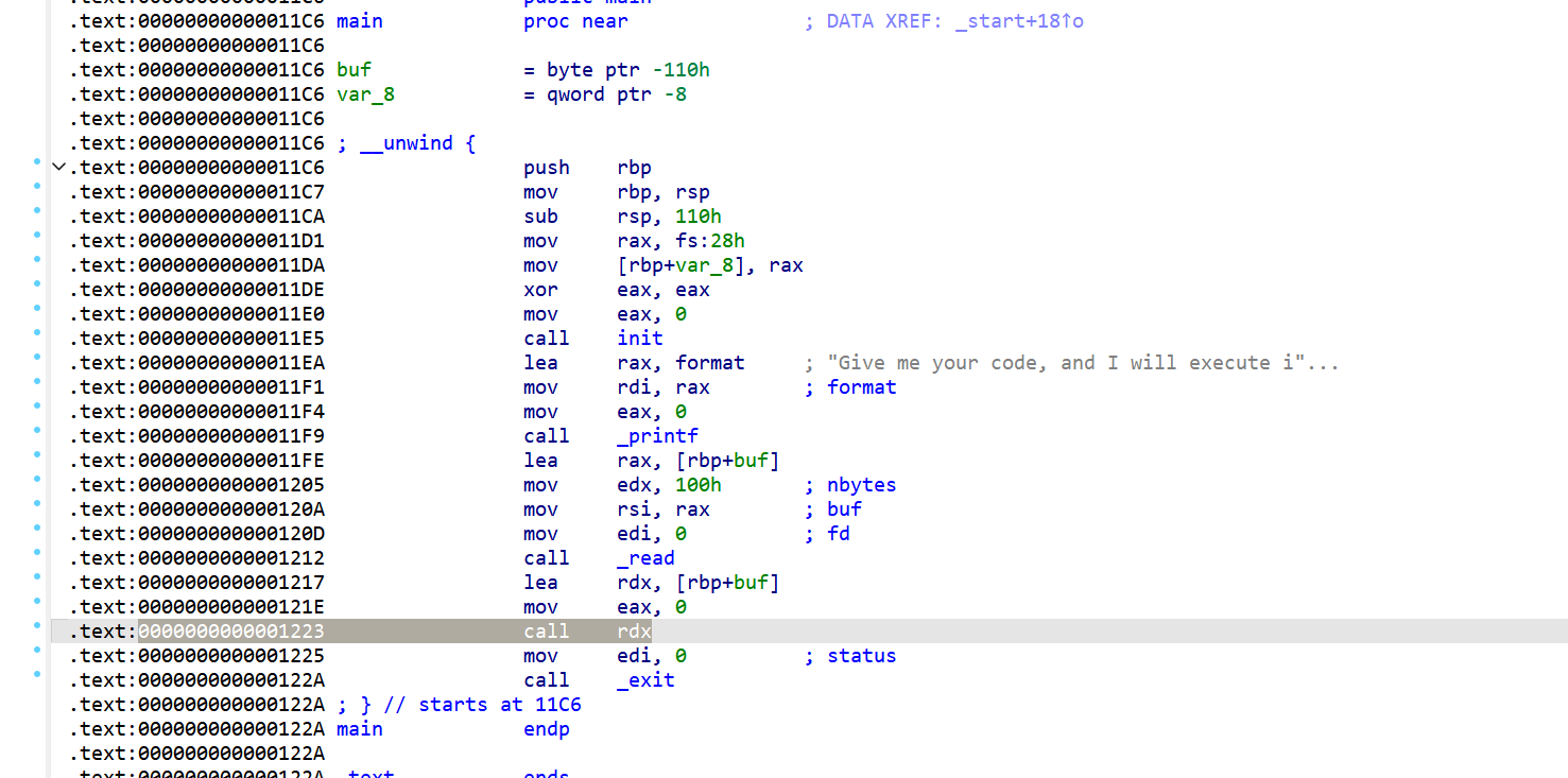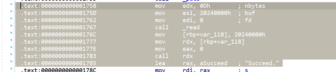 我们看这段汇编,call rdx指令就是调用shellcode的,call指令会将返回地址压栈,就是0x1785