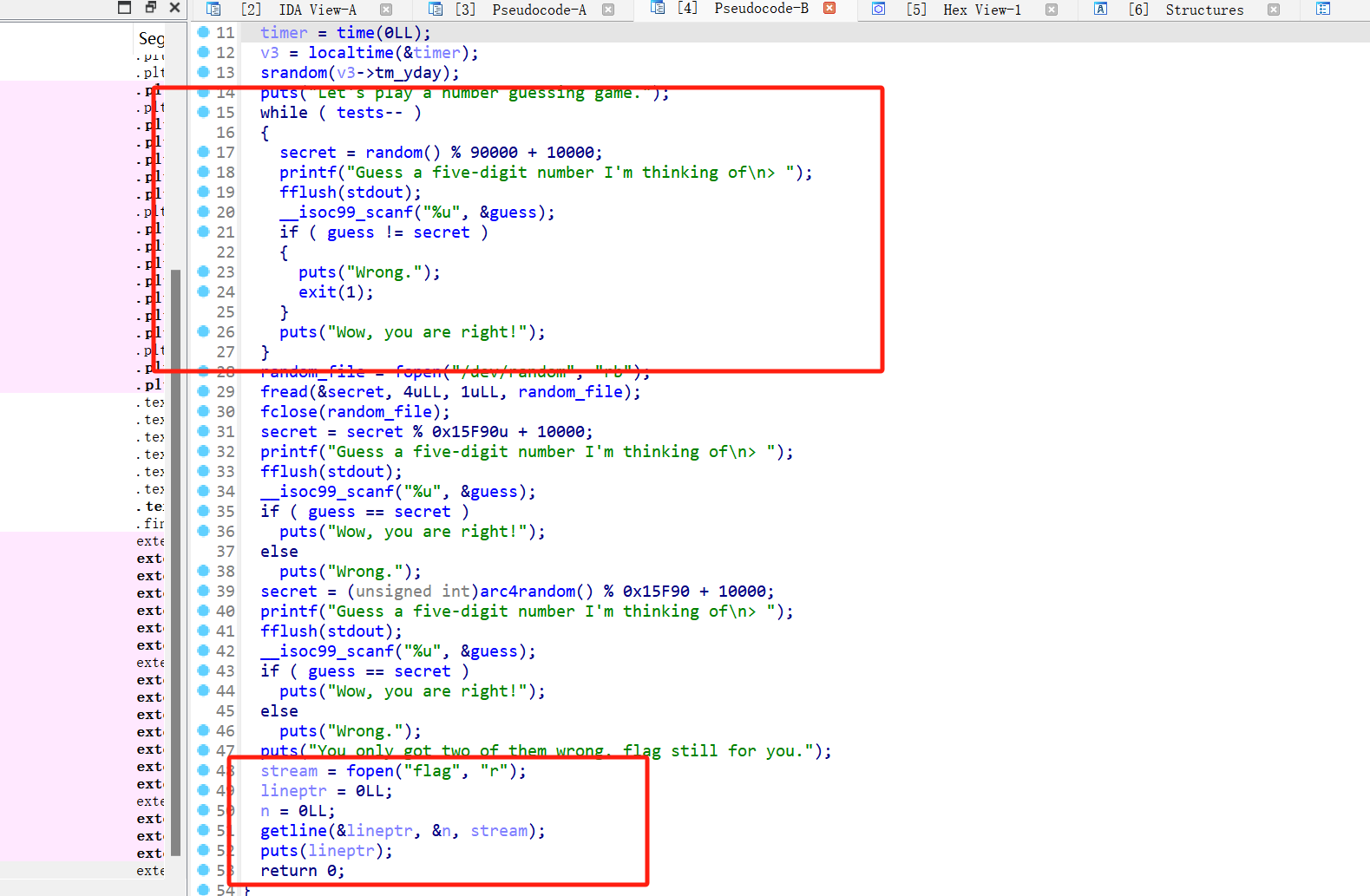 IDA查看程序,看起来是一个随机数预测,上面框起来的部分用timer的day作为种子,所以很好预测,可以绕过。