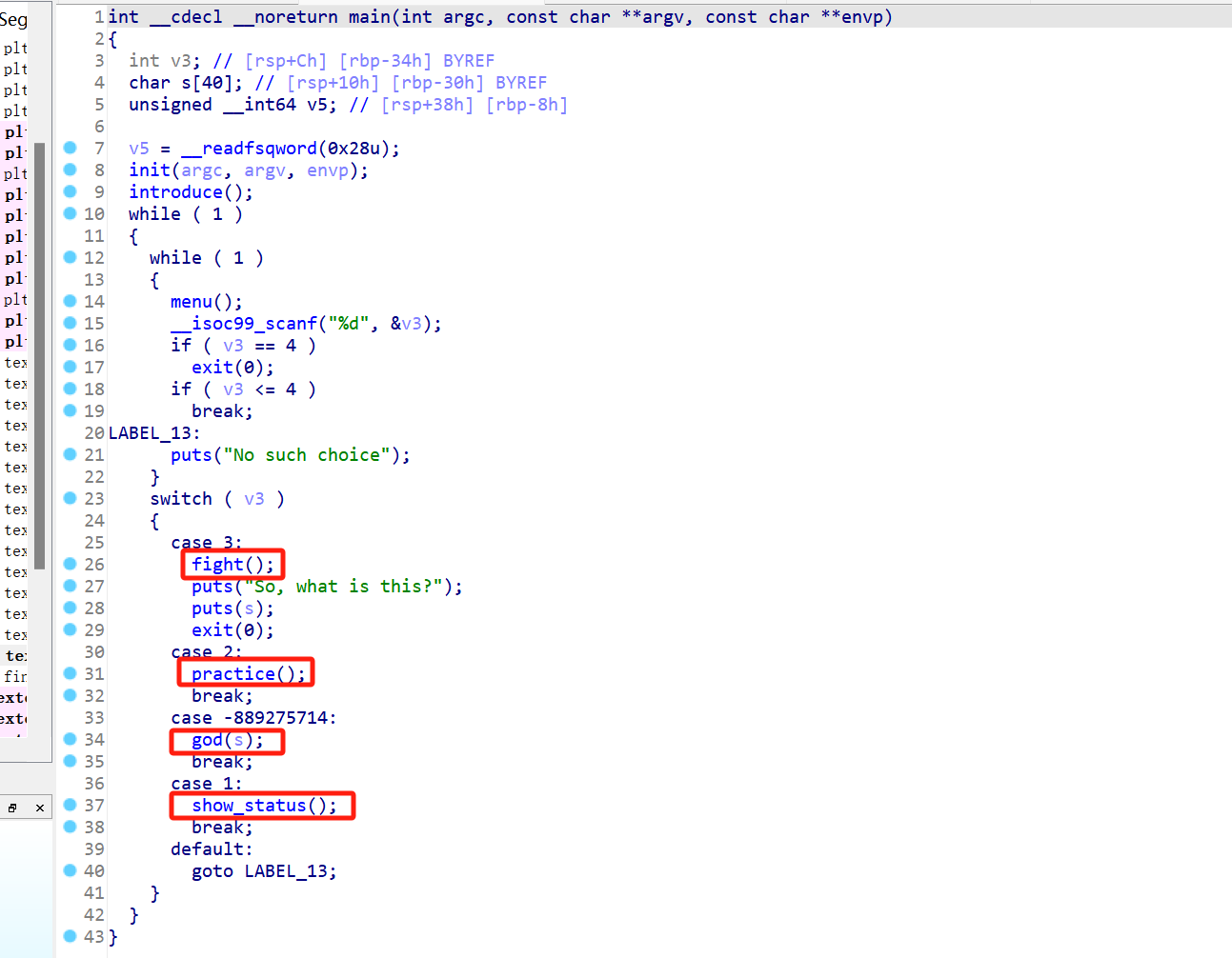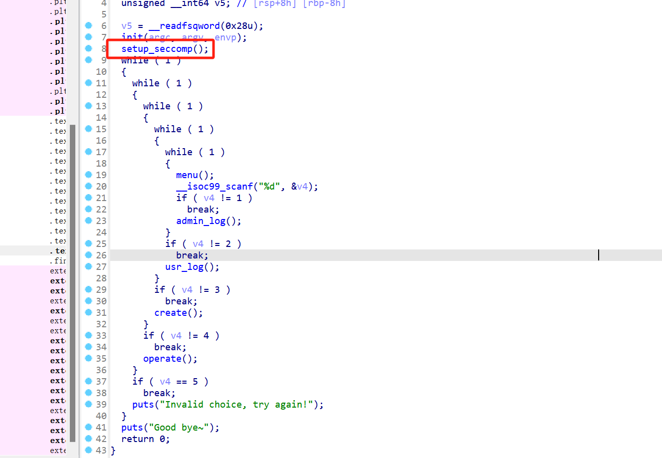 IDA查看程序,加了沙箱ban了system,然后还有一堆的函数。一个个看。