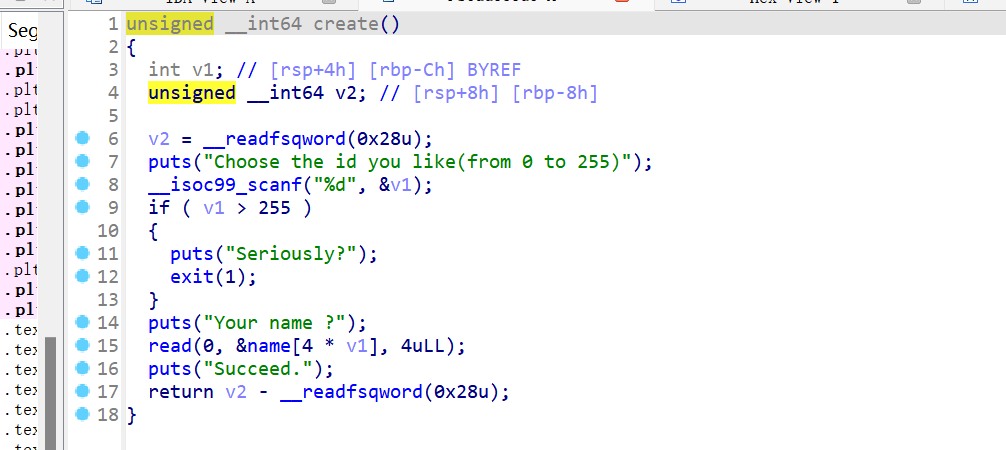 同时我们观察到pwd是作为全局变量的,create函数中有一个负数溢出,我们可以直接把地址溢出到pwd的地址处,读写覆盖。
