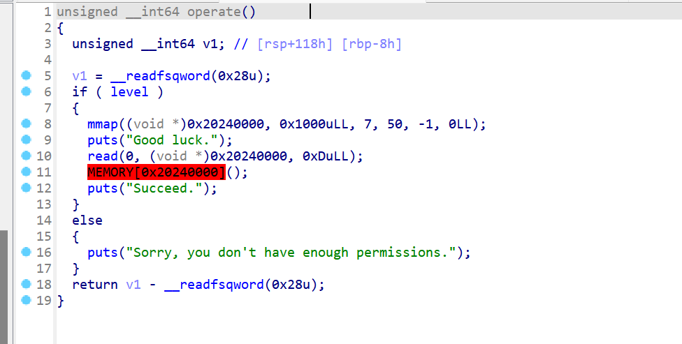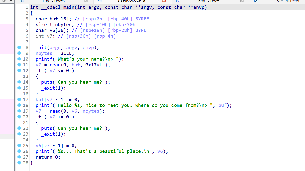 main函数里面有两个漏洞点,可以通过buf溢出去覆盖nbytes,来达到溢出v6的目的。