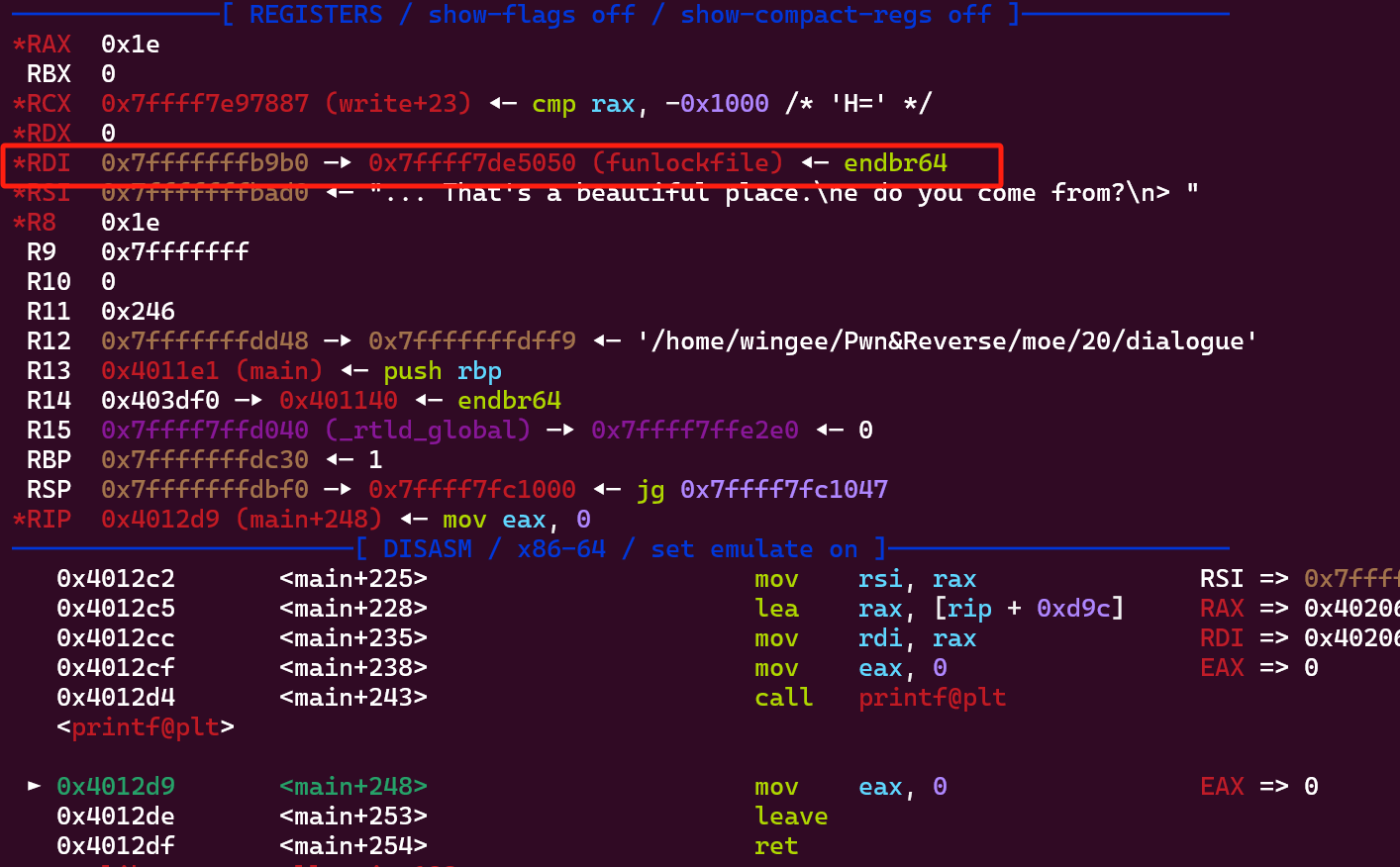 但是很有意思的一个点,通过动态调试可以发现,在main函数结束完最后一个printf返回的时候,rdi在printf函数里被设置成了一个指针,指向一个名为funlockfile的libc函数。
