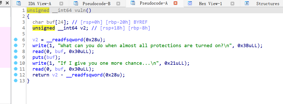 常规思路,第一次泄露canary,第二次跳到后门函数。但是观察到函数开了PIE,这里也只有8个字节的溢出,所以必须跳回vuln函数不能只输入两次。