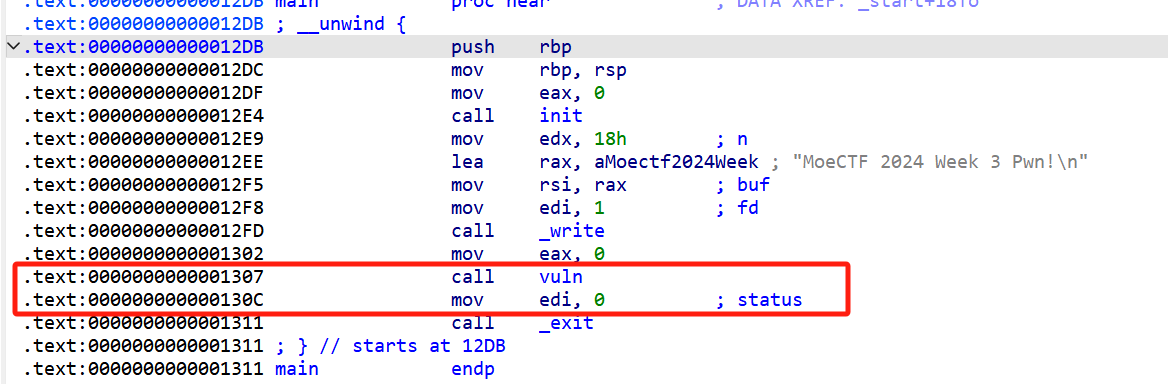 vuln函数是被main程序调用的, 看main函数里面这两句代码的地址关系: