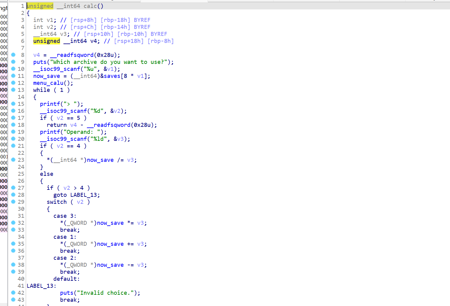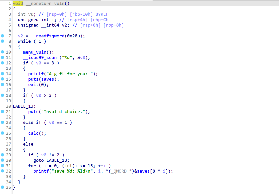 IDA查看,vuln函数支持一个对saves数组实现增改计算的功能。