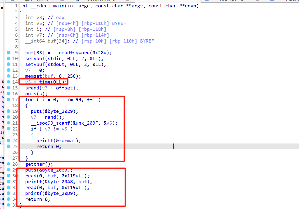 程序开了canary,time(0LL)就是拿当前时间戳,只要网速够快就可以保证本地和远端时间戳同步,加上offset就可以得到随机数种子。