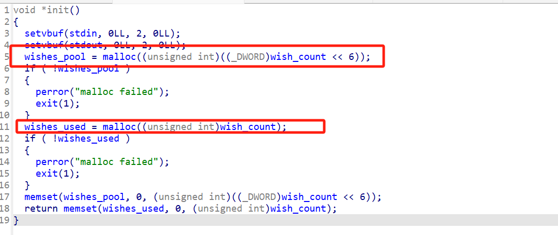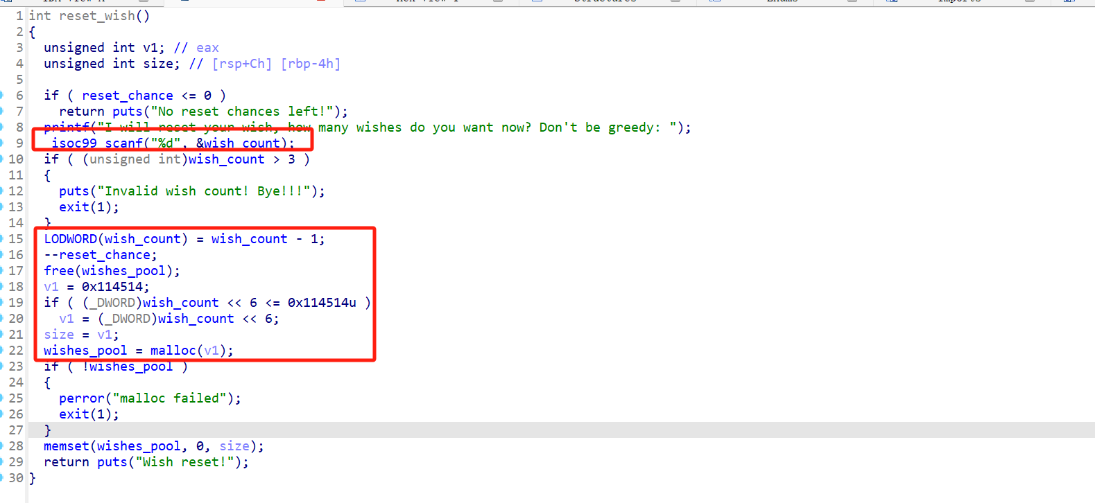 在reset里可以重置愿望池子,这里有一个很明显的负数溢出的漏洞。当我们输入wish_count是0时,会绕过wish_count > 3d的检测,下面会把wish_count - 1,就变成了一个很大的无符号整形数。接下来由于这个count特别大,最终分配的新的愿望池子的size就是0x114514