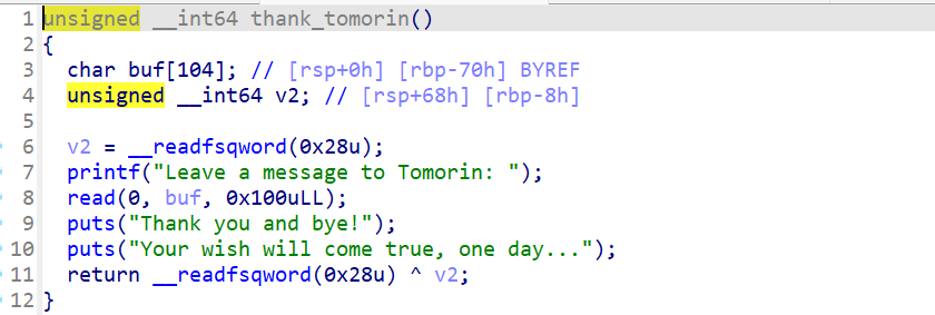 先看thank, 是白给的一个栈溢出,但程序里没有提供后门函数,而且开了PIE,想要溢出还要泄露canary。