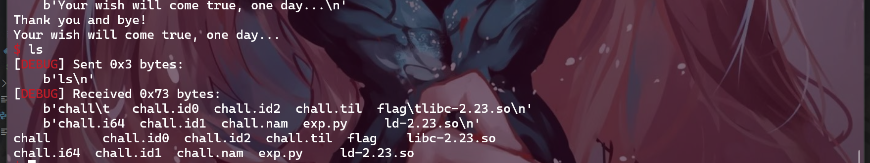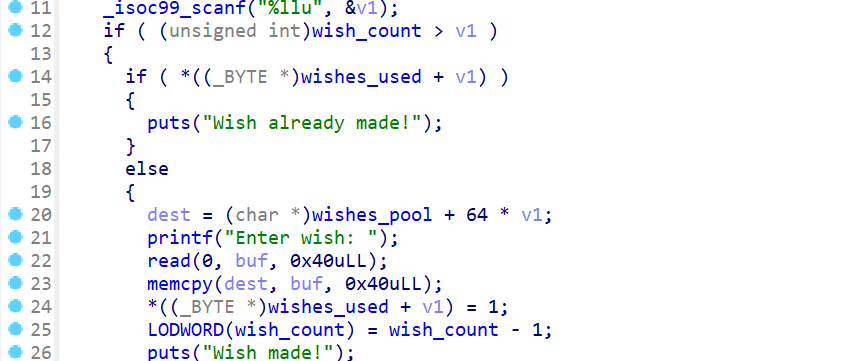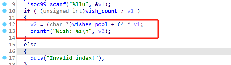从之前几个函数的操作中可以得知,他们对于愿望池的内存访问都是根据wish_count来的,所以我现在可以越界访问堆块外的数据。