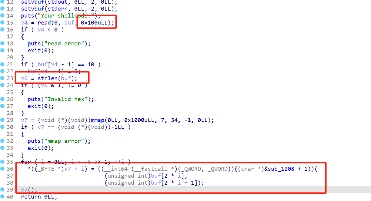 可以输入0x100个字节,strlen要求不能有\x00字符,不然会被截断,下面还有一个check,函数里面的意思就是保证shellcode里不能有[A-Za-z0-9]