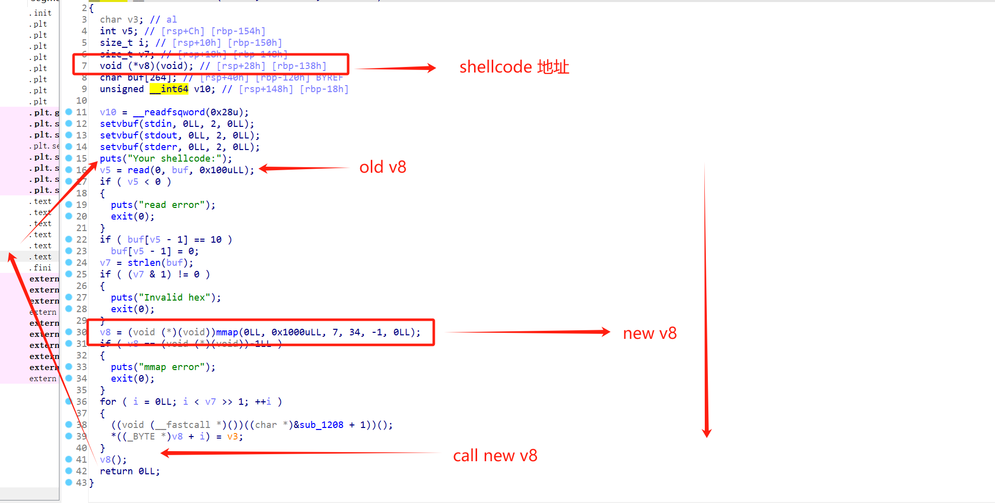 read函数重新输入,这时候输入的地址是我们第一次mmap的地址,但read之后会在进行一次mmap, 这时候v8会被刷新为一个新的地址,那么存入new v8的数据,就是栈上的buf。注意这个buf, 等我们第二次mmap的时候,buf里存储的仍然是我们第一次输入的shellcode, 最终会call new v8, 再次运行一遍我们第一次输入的shellcode。 - 所以我们需要让一份