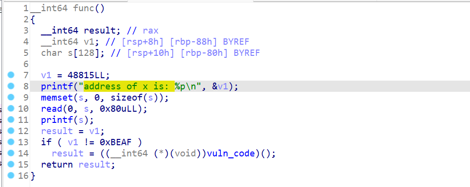 程序告诉了我们一个变量在栈中的栈地址,并且初始值为0xBEAF,并且给出了一个栈上的格式化字符串漏洞。