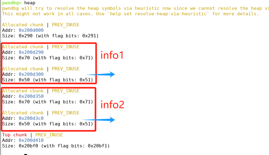 此时heap_addr + 0xb0是第三个info堆块,是合法堆块,这样就可以绕过free的检查。
