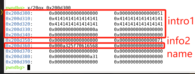 题目的漏洞和overflow大体一样,都是可以溢出intro堆块的0x20字节,这0x20字节我们可以做两件事: