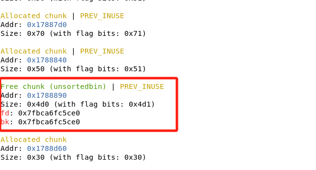 再申请一个堆块,切割unsorted bin,泄露libc和heap_addr