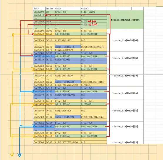 即 tcache_entry->next中存放的chunk地址为与自身地址进行异或运算后所得到的值 , 这就要求我们在利用 tcache_entry 进行任意地址写之前 需要我们提前泄漏出相应 chunk 的地址,即我们需要提前获得堆基址后才能进行任意地址写