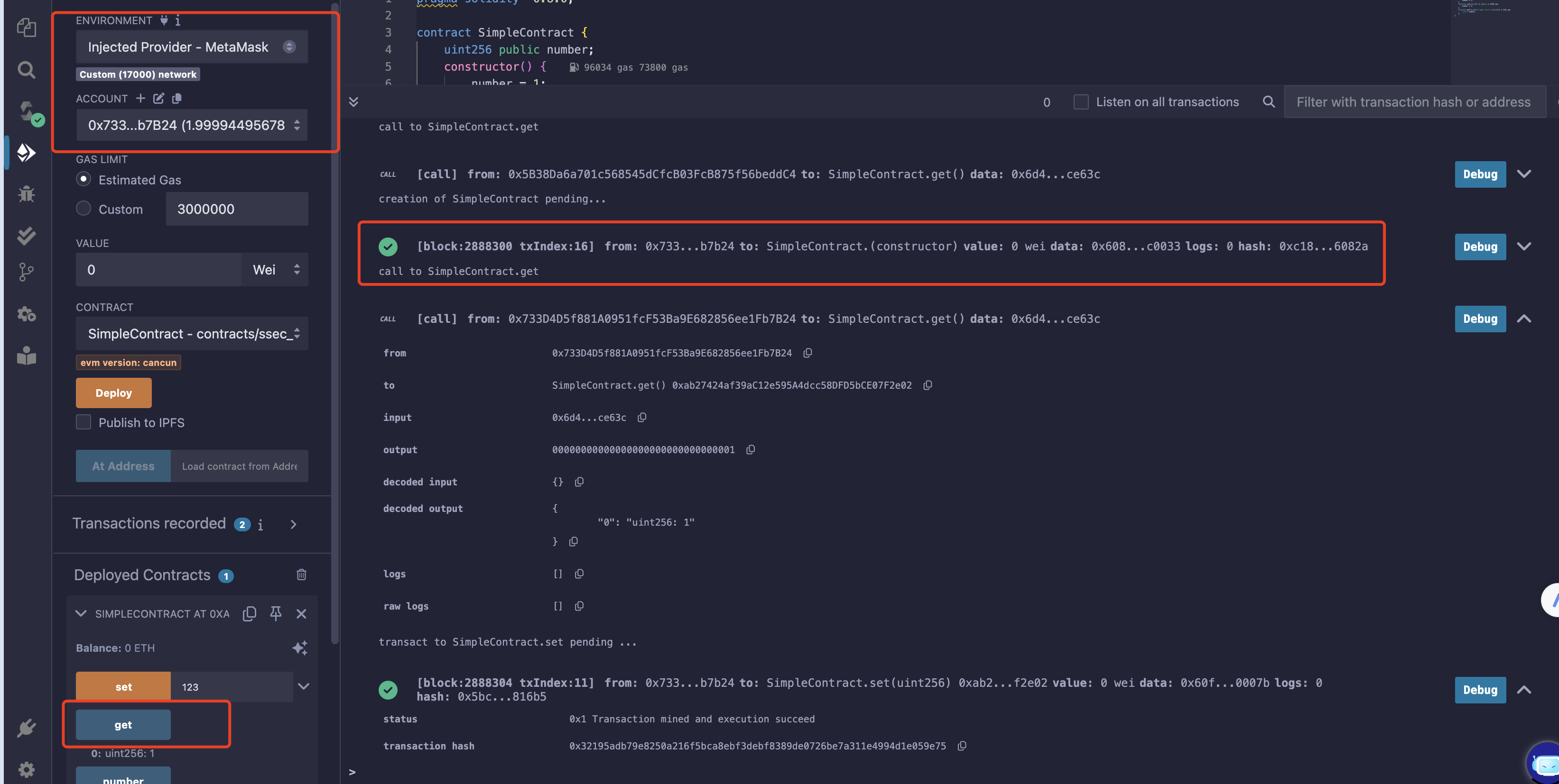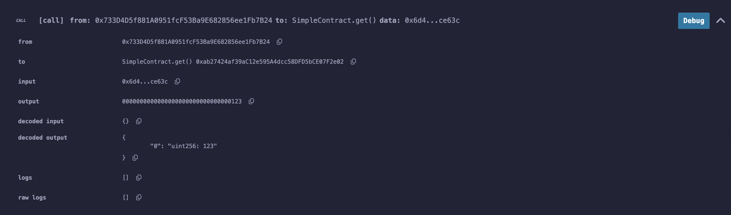 1 2 3 4 5 6 7 8 9 10 11 12 13 14 pragma solidity ^0.8.0; contract SimpleContract { uint256 public number; constructor() { number = 1; } function set(uint256 x) public { number = x; } function get() public view returns (uint256) { return number; } }