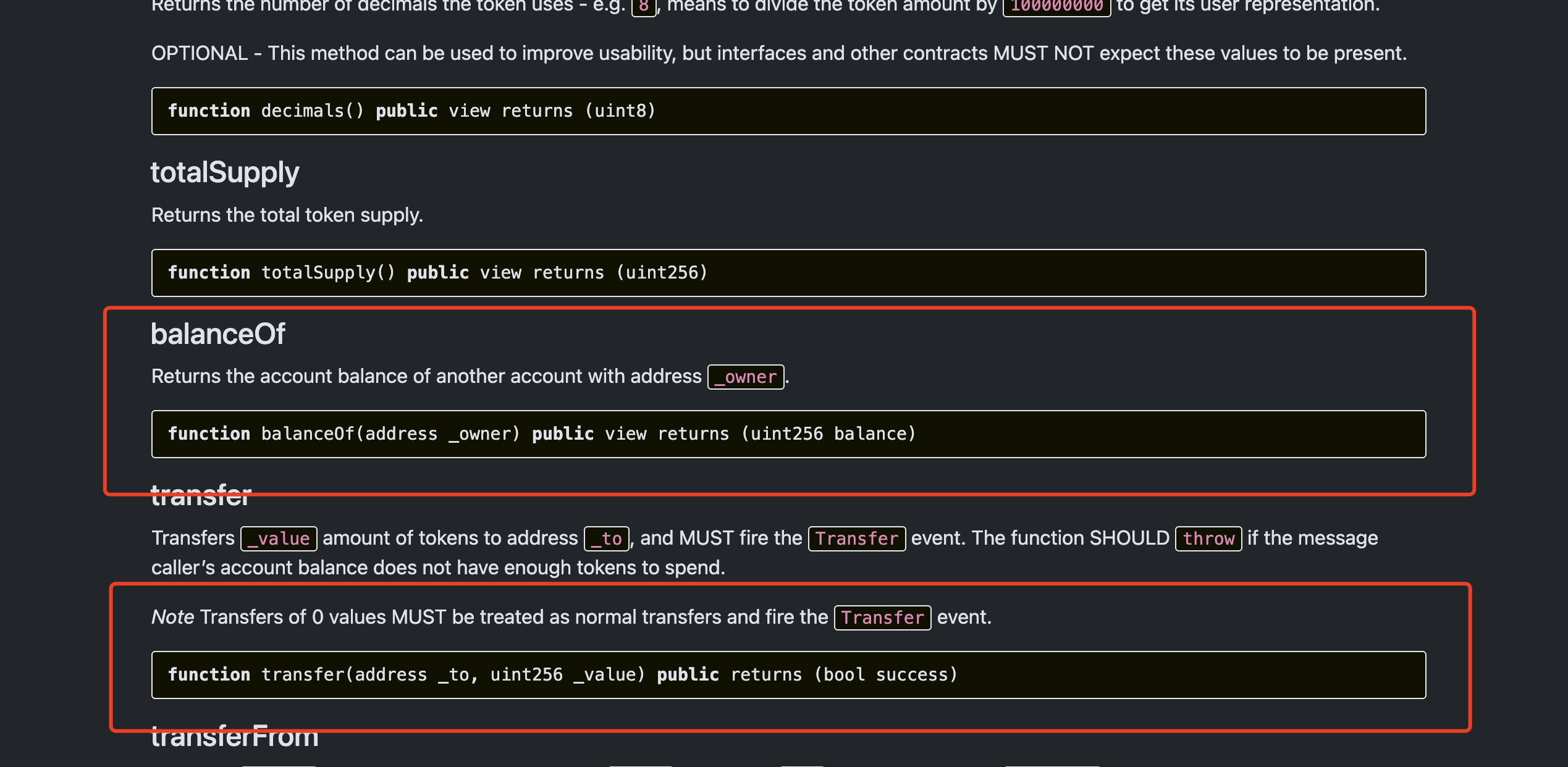查看ERC20的文档,发现里面有一些合约中最基本的函数,比如transfer和balanceof等等