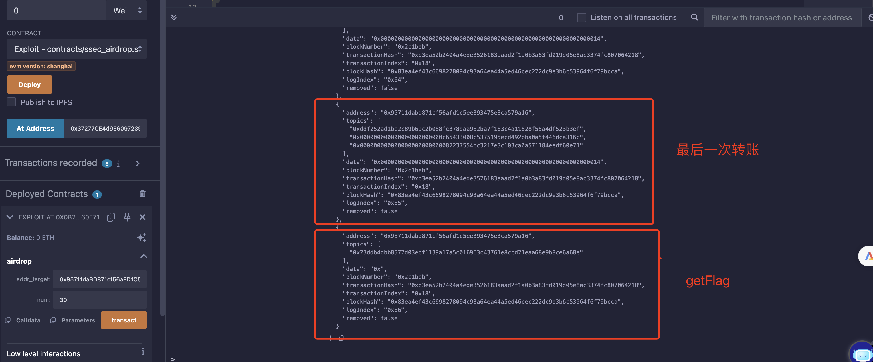 这样,我们可以多次触发 profit() 和 transfer() 函数,并积累大量代币达到getFlag的需求。